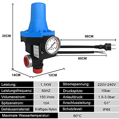 Specification: NAIZY Drukbewaker, drukschakelaar, 10 bar, pompbesturing met kabel, automatisch in- en uitschakelen, constante waterdruk voor tuin, huis, huiswatervoorziening, tip C