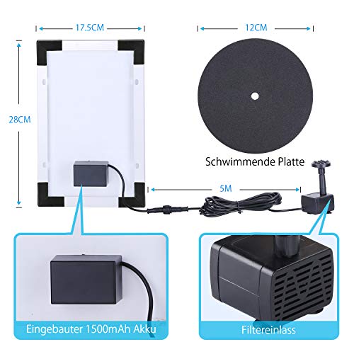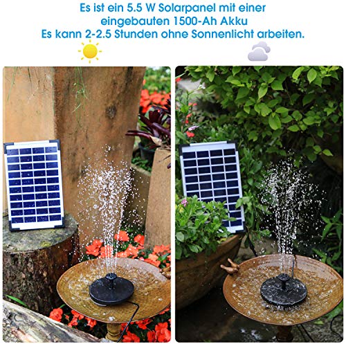 Specification: AISITIN Fontein op zonne-energie, 5,5 W, ingebouwde 1500 mAh batterij, solar vijverpomp, waterpomp, drijvende fonteinpomp met 6 fonteinstijlen voor vogelbad/kleine vijver/tuin/watercirculatie
