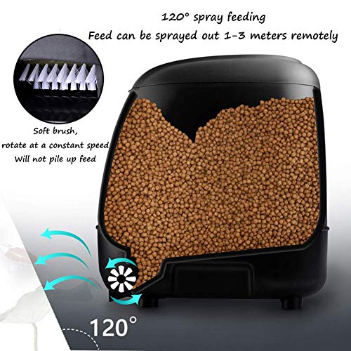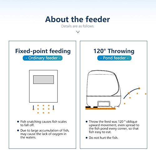 Grote hoek: 120 ° spray-type voeding, gelijkmatig verspreiden van het graan, zodat de vissen niet vechten om voedsel en verwondingen, kan 1-3 meter op afstand spuiten.